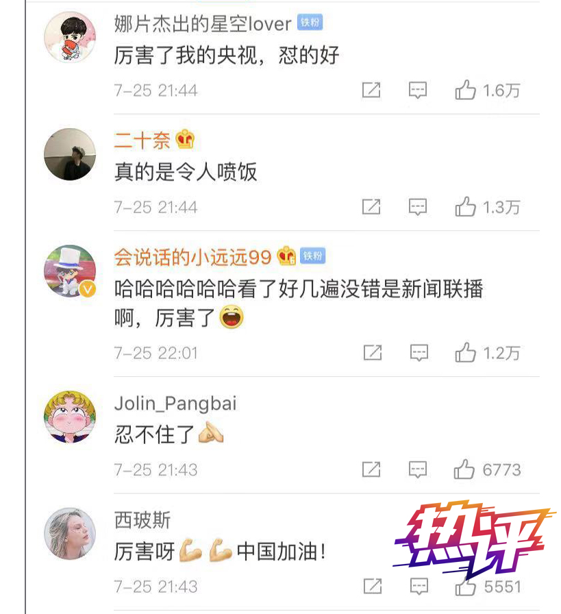 “令人喷饭”迅速刷屏,很快跻身微博十大“热搜榜单”。短短10小时,阅读量达到1.4亿次,引发了4多万次讨论。网上评论妙语连珠:有人说,“看新闻联播‘涨知识’,晚饭时学了新成语”;有人夸赞,这样的表达“霸气十足”、“彰显国威”;还有人说,“怼得漂亮”。